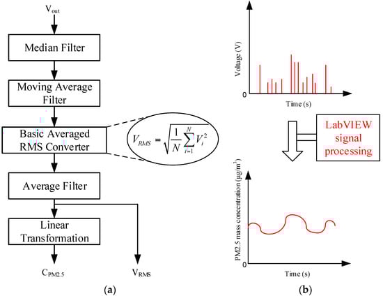 Similar to the RMS (Root Meam Square) moving average method in reference [], a signal processing program was written using LabVIEW. As illustrated in Figure 4, the scattered light signals of the three photodiodes are conditioned by Median Filter, Moving Average Filter and so on. The rectangular window is applied to the record scattered light signals before RMS computation. In addition, the averaging time of the RMS value is one second. Mass concentrations as well as voltage signals are recorded once per second.