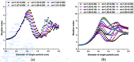From Figure 5, it can be concluded: (1) For a single particle, the weather index increases with diameter and reaches the maximum value at about 1.0 μm; (2) the weather index of absorbing particles is larger than that of non-absorbing particles; and (3) the weather index decreases with the real part of the refractive index when theparticle’s diameter is between 1.0 μm and 1.5 μm.