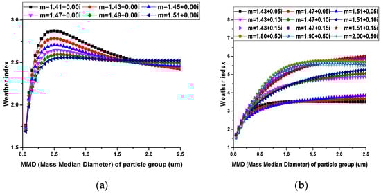 From Figure 6, similar conclusions can be drawn: (1) For a group of non-absorbing particles, the weather index increases sharply with MMD and reaches the maximum value when MMD is about 0.6 μm and then decreases slowly. (2) For a group of absorbing particles, the weather index increases with MMD and the weather index decreases with the real part of the refractive index and increases with the imaginary part of the refractive index when MMD is between 0.5 μm and 1.0 μm.