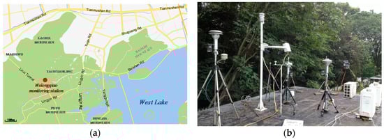 Field experiments were conducted at the Wolongqiao monitoring station, anational monitoring station of the National Ambient Air Quality Automatic Monitoring Network, operated by the Ministry of Environmental Protection of China. The station is situated at 30°14′44″ N, 120°07′37″ E. As illustrated in Figure 7, the station is surrounded by forests and is suitable for studies on the meteorological effect of PM2.5 monitoring. There is a city expressway to the north side of the station and a tunnel to the southwest of the station. Automobile exhaust is one of the main sources of air pollution on weekends and holidays, while during the working days, air quality near the station is better than other areas of the city. The station is equipped with a TEOM 1405-D monitor (Thermo Fisher Scientific Inc., Waltham, MA, USA, with a precision of ±2.0 μg/m3) to measure PM2.5 and PM10 mass concentrations simultaneously and can be used as a reference PM2.5 instrument in field experiments.