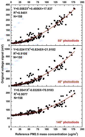 Figure 9 shows the relationship between the output voltages of the three photodiodes in the particle sensor with 1-h average PM2.5 mass concentrations given by TEOM 1405-D. Quadratic polynomial regression is adopted considering the nonlinearity. The fitting degree of curvilinear regression is examined by coefficient of determination (R2) and root mean square error (RMSE). There is a significant correlation between the output of the photodiodes and the PM2.5 mass concentration.