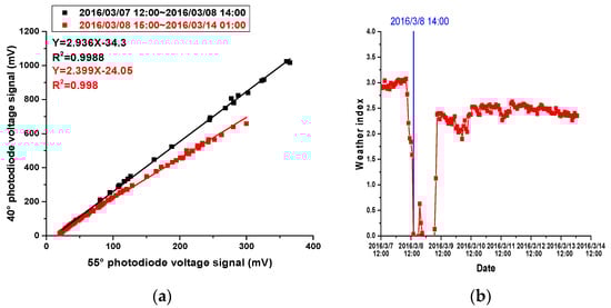 Parameters of the weather index: (a) Scatter plot of the 55° photodiode voltage signals vs. the 40° photodiode voltage signals, (b) Variation of the weather index during the measurement period.