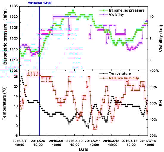 The new particle sensor was tested at the Wolongqiao monitoring station from 7 to 14 March 2016. Hourly PM2.5 and PM10 mass concentrations from the TEOM 1405-D monitor were recorded simultaneously. Half-hourly meteorological parameters such as visibility, barometric pressure, wind speed, wind direction and weather types from a nearby weather station were also recorded. Before experiments are conducted, zero-point calibration needs to be conducted using a HEPA (High Efficiency Particulate Air) filter (TSI Inc., Shoreview, MN, USA).