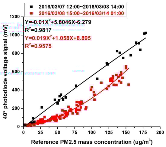 As illustrated in Figure 10, the scatter plot of the 1-h average PM2.5 mass concentrations based on the 55° photodiode and the 40° photodiode in the particle sensor follow two distinct trends. According to the variation of the weather index, the weather index is relatively stable, i.e., approximately 3.0 for the first 20 h, and then drops sharply below 0.0 at 8 March 2016 14:00 with decreasing PM2.5 mass concentrations; then, the weather index increases sharply to about 2.5 and becomes stable until the end of the measurement. One of the possible reasons that the weather index can be less than zero is that the 40° photodiode does not receive a sufficient voltage signal when the PM2.5 mass concentration is very low (e.g., less than 20 μg/m3) and the voltage of the 40° photodiode can even be negative when system noise voltage is removed from photodiode voltage. This abnormal phenomenon only occurs when the PM2.5 mass concentration is less than 20 μg/m3 and should be considered separately. One of the possible solutions is to use the traditional PM2.5 mass concentration of the 40° photodiode (linear transformation of the 40° photodiode voltage signal) when the PM2.5 mass concentration is less than 20 μg/m3. Because the particle size distribution can only change slowly, data points are broken into two continuous parts according the value of the weather index. The two parts are separated by 8 March 2016 at 14:00 h. Both parts of the data points were analyzed by linear regression, and the results were excellent, indicating that during different periods of time, parameters of the PM2.5 particles are distinct, while parameters are stable during the same period of time.