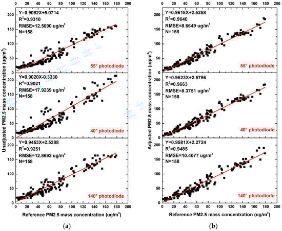 Scatter plot of the 1-h average PM2.5 mass concentrations using the reference Tapered Element Oscillating Microbalance (TEOM) 1405-D monitor at Wolongqiao monitoring station vs. PM2.5 mass concentrations based on three angular photodiodes in the particle sensor: (a) unadjusted; (b) adjusted.