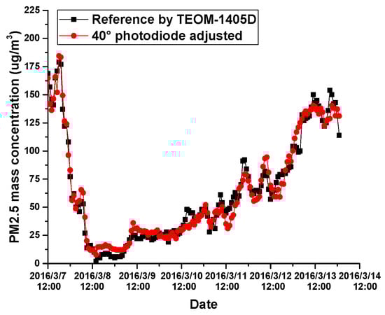 Figure 13 displays the relationship between PM2.5 mass concentrations of three photodiodes and reference TEOM 1405-D monitored 1-h average PM2.5 mass concentrations before and after correction. It can be seen that the measurement accuracy and linearity are improved greatly after correction. Photodiodes at the angles of 40° and 55° perform very well. These results are consistent with results using an expensive optical particle counter (Grimm 1.108) (R2 = 0.97) [] and better than field experiments using an aerosol monitor DustTrak (R2 = 0.859) []. In summary, PM2.5 mass concentrations measured by the three photodiodes are similar if MMD is stable. When MMD varies, the measurements will be affected. After correction by WI, photodiodes at the angle of 40° and 55° can result in a favorable performance.