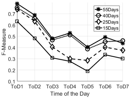 As described in the previous section, we varied the learning sets using different numbers of days (55, 40, 25, 15 days). Figure 2 reports the average F-Measure over the different Times of the Day. The high value of F-Measure is for the “55-days” configuration for the training set. It is worth mentioning that the highest values for F-Measure correspond to the night-time (ToD1–0.7896), whereas the lowest values correspond to the central part of the day (0.4804 and 0.4045 for ToD3 and ToD5, respectively). This confirms that during the central part of the day there is a lot of variability in the behaviour, which is not easy to identify with unannotated data. Indeed, this trend is confirmed by results obtained from all the different dataset sizes. However, the “planned” visits (i.e., care-package or routine visits from family members) could be considered as systematic noise in the system, and could be seen as being an integral part of the individual’s behaviour pattern. During the night we have no external visits and no visits from professional carers, thus we can consider this time period as the optimal configuration to estimate the baseline behaviour. It is important to notice also that the “40 days” configuration gives similar results, however, in this study, we decided to focus on the “55-days” configuration for the training set because it has good results for all the considered ToD. According to the methodology described in the previous section, the “55 days” configuration means a total of 78 days analysed: 55 days for the training of the models and 23 days to test the models with unseen data.
