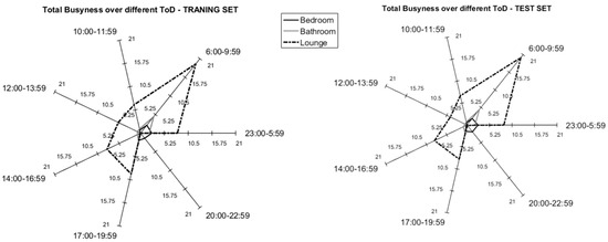 According to Wang et al. [32], a resident with a sedentary lifestyle could generate only 50 motion events, whereas an active person may generate more than 400 motion events per hour. Consequently, in order to estimate whether our participants lead a sedentary lifestyle or not, the mean “busyness” value was computed as the mean value over the different ToDs.