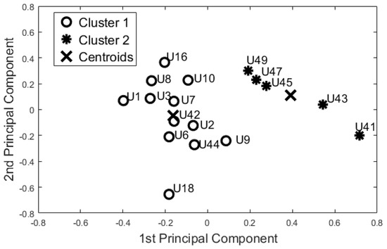 Then, PCA and SM were applied to this reduced dataset to visualise the feature space. According to the Kaiser Rule, we reduced all the learning datasets to 14 components, and with the SM techniques we also reduced the dataset to a bi-dimensional problem (from 14 components to 2 components). Both unsupervised methods showed the same cluster groupings as depicted in Figure 5. The Dunn’s index was equal to 0.196, whereas the Silhouette index was equal to 0.469 for both algorithms. Comparing these results with the Night-time analysis (Figure 4), participants U44, U42, U18, U10, U16, and U41 were grouped in a different cohort. The other participants were classified in the same cohort as the night-time analysis.