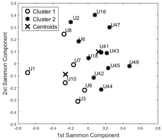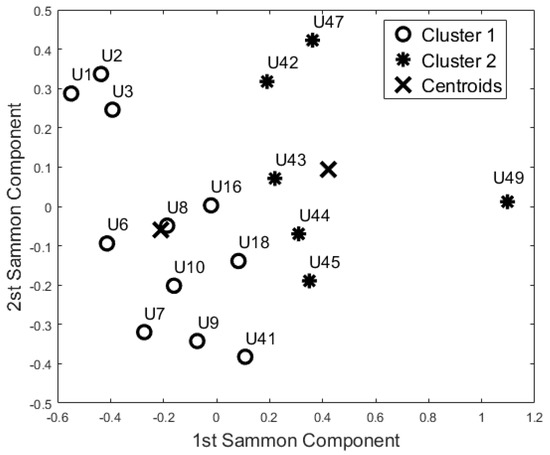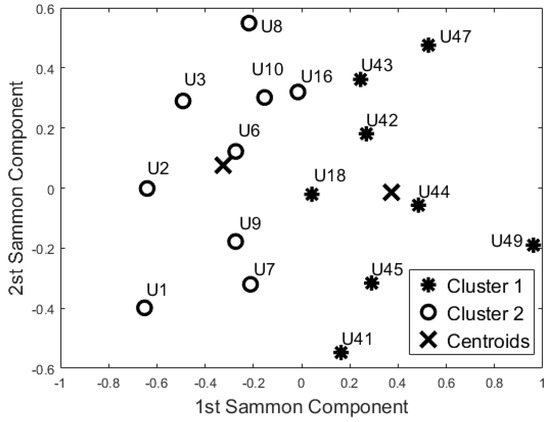 From a visual inspection of the SM (Figure 5), participant U1 is further away from the other participants. Particularly, participants U1 and U49 (ED = 2.332) are the furthest away. The mutually closest points on the map are participants U42 and U44 (ED = 0.250). These two ED values have been used as the maximum value in the computation of the Simi matrix. The closest points with Simi < 0.05 are participants U18 and U8 (Simi = 0.023). Other points closer to Simi are between 0.051 and 0.1, which are U41 and U18 (Simi = 0.051), U7 and U9 (Simi = 0.057), U3 and U7 (Simi = 0.080), U9 and U16 (Simi = 0.082), U42 and U43 (Simi = 0.082), U16 and U43 (Simi = 0.086), U45 and U43 (Simi = 0.089), and U2 and U7 (Simi = 0.097). The Simi matrix confirms that participant U1 is the most distant point in the feature space.