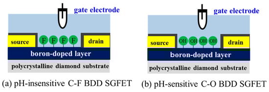 Schematic of a pH-insensitive fluorine-terminated boron-doped diamond (BDD) solution-gate field-effect transistor (SGFET). (a) pH-insensitive fluorine-terminated BDD (C-F BDD) SGFET; (b) pH-sensitive oxygen-terminated BDD (C-O BDD) SGFET.