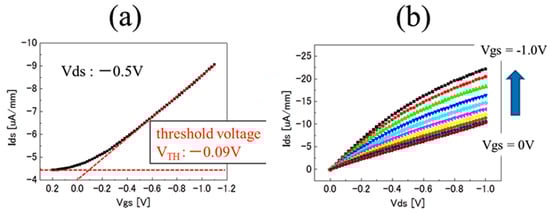 Device properties of an electrolyte-solution-gate diamond FET (SGFET) with a fluorine-terminated boron-doped layer in a 1 molar PBS buffer solution (pH 7.4). (a) Ids-Vgs characteristics at Vds = −0.5 V in the range of −1.0 V to 0.2 V; (b) Ids-Vds characteristics at Vgs in the range of −1.0 V to 0 V.