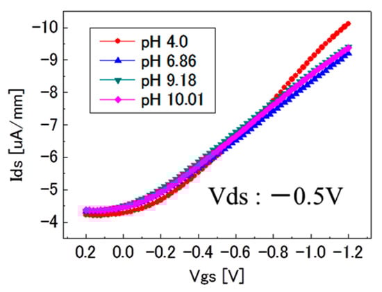 For the evaluation of the pH-insensitivity of C-F BDD SGFET and the pH-sensitivity of oxygen-terminated BDD (C-O BDD) SGFET, the experimental results of the FET-IV profiles were obtained using pH standard solutions such as pH = 4.01 (phthalate buffer), 6.86 (phosphate buffer), 9.18 (tetraborate buffer) and 10.01 (carbonate buffer) with reference to JIS (Japanese Industrial Standard) K0802 and JIS Z 8802. Figure 3 shows the FET-IV characteristics of pH-insensitive C-F BDD SGFET. A family of Ids-Vgs curves were generated by applying a series of step voltages at the Ag/AgCl gate electrode. The pH-insensitivity of the C-F BDD SGFET at fixed Ids and Vds values was calculated from the data shown in Figure 3. The obtained results are shown in Figure 4 as a blue box plot with an error bar that indicates the standard deviation (n = 5). The sensitivity was less than ca. 3 mV/pH at Ids = −7 µA/mm. The Vgs decreased with the pH over the entire investigated pH range of pH 4.01 to pH 10.01. By contrast, the pH-sensitive C-O BDD SGFET was also evaluated. The C-O BDD SGFET used in this work was prepared with the help of the same process described in our previous study []. The sensitivity of the C-O BDD SGFET is also shown in Figure 4 as a red rhombus point. The sensitivity is 37 mV/pH, which is at least 10 times higher than that of the sensitivity of the C-F BDD SGFET and is enough to be employed as a pH-sensitive SGFET.