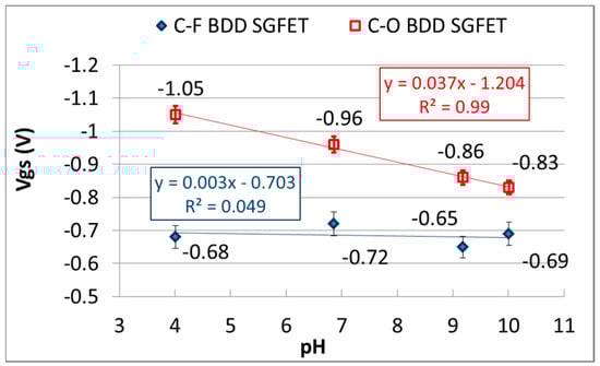 pH-insensitivity of the C-F BDD SGFET and pH-sensitivity of the C-O BDD SGFET.
