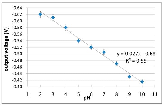 A device specification of the differential FET using pH-insensitive C-F BDD SGFET and C-O BDD SGFET was examined by a lab-made ISFET pH-mV meter equipped with a source-follow circuit. Figure 5 is a schematic diagram of the differential FET measurement using the source-follow circuit. Figure 6 shows the experimental results of the all-solid-state pH sensor with a pH-sensitive C-O BDD SGFET and a pH-insensitive C-F BDD SGFET, with an error bar that indicates the standard deviation (n = 4). The horizontal axis is the pH of the solution, and the vertical axis is the differential output voltage. The output was shifted with linearity corresponding to the pH. A good output response was obtained with good linearity between pH 2 to 10 with R2 = 0.99. These results suggest that the combination of the pH-insensitive C-F BDD SGFET, the pH-sensitive C-O BDD SGFET, and platinum QRE was employed as the all-solid-state pH sensor.