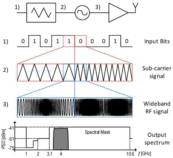 - Chen, F.; Li, Y.; Lin, D.; Zhuo, H.; Rhee, W.; Kim, J.; Kim, D.; Wang, Z. A 1.14mW 750kb/s FM-UWB transmitter with 8-FSK subcarrier modulation. In Proceedings of the 2013 IEEE Custom Integrated Circuits Conference (CICC), San Jose, CA, USA, 22–25 September 2013; pp. 1–4. [Google Scholar]