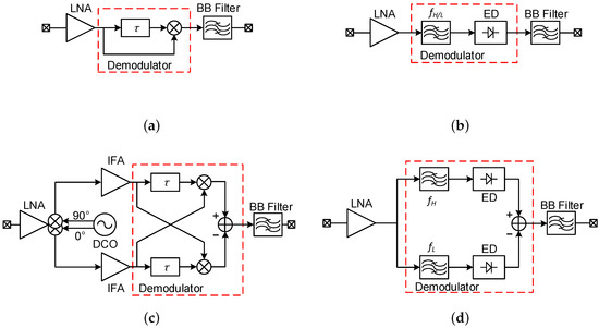 FM-UWB receiver architectures reported in literature: (a) delay-Line demodulator at RF; (b) regenerative demodulator; (c) baseband delay-Line demodulator and (d) dual-band-pass-filter demodulator (balanced frequency discriminator).