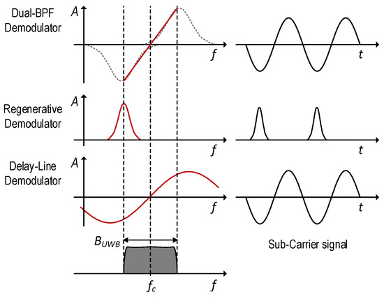 Different FM-UWB receiver implementations can be found in the literature. A simplified block diagram of each of the proposed architectures is shown in Figure 3. The wide-band FM demodulator based on a delay-line (DL) demodulator (Figure 3a) was initially proposed in [8]. Assuming that the delay is relatively small, the demodulated signal can be represented as [8]
