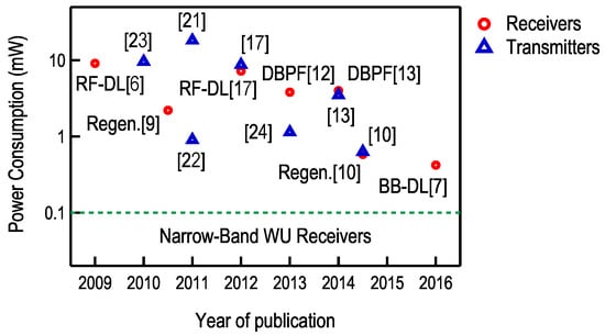 The above sections described the most important power reduction techniques applied in the FM-UWB transceivers. These techniques, combined with technology scaling, led to sub-milliwatt power levels in today’s implementations. The evolution of power consumption over the past eight years is illustrated in Figure 5 for both transmitters and receivers.