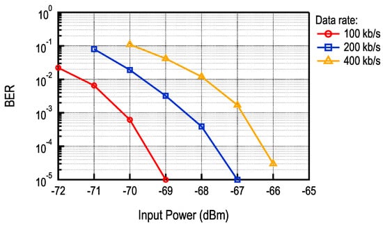 The BER curves for different data rates are shown in Figure 7. In all cases, orthogonal frequencies are used with a modulation index of 0.5. As expected, the sensitivity of the receiver decreases due to increased bandwidth of the sub-carrier signal. Nevertheless, if the distance between nodes is small enough and the channel is sufficiently good, higher communication speeds can be used to decrease latency in the network. In this case, the limitation to data rate comes from the filter following the FM demodulator, which was designed for sub-carrier frequencies from 1–2.5 MHz.