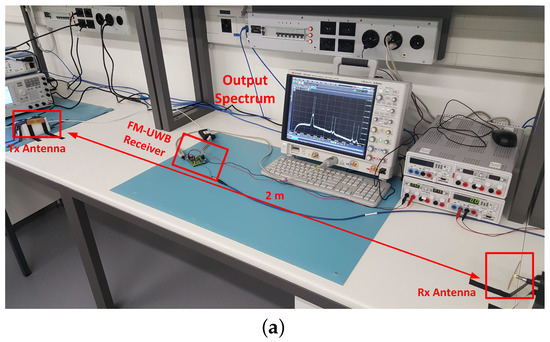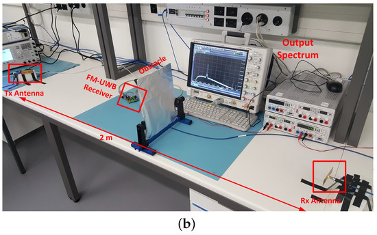 Figure 8 shows the test setup that demonstrates over the air communication. The distance between the two antennas is approximately 2 m, roughly corresponding to the distances that are targeted for short range communications in a WBAN (although still simplistic compared to a real use-case scenario). The signal is transmitted at −15 dBm, somewhat lower than the allowed power in the UWB frequency range. Oscilloscope screen shows the spectrum of the demodulated signal (using the FFT). Two cases are presented. In the first, there is a line of sight propagation between the transmit and the receive antenna, while, in the second, an obstacle is placed between the two antennas. The degradation of the link quality can be observed on the oscilloscope screen once the obstacle is in place; however, it is still possible to establish communication. In the first case, BER is below , while, in the second, it increases to . In both cases, 100 kb/s 2-FSK modulation is used. The two examples are shown; however, the BER will vary as the location of the obstacle changes, as well as the surroundings in general.