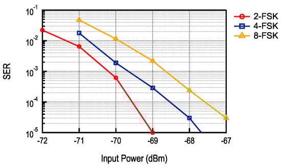 The example in Figure 9 shows performance, in terms of Symbol Error Rate (SER), for different M-FSK modulations. With the implemented receiver baseband bandwidth, up to 8-FSK signal can be received at 100 ksym/s. In general, M-FSK offers better sensitivity for the same data rate; however, it also requires a more complex M-FSK demodulator. The selection of the most efficient modulation then depends on the targeted application.