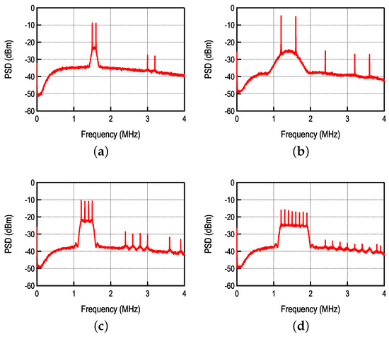 Demodulated spectrum for different symbol rates and different sub-carrier modulation complexity: (a) 100 kb/s, 2-FSK modulation; (b) 400 kb/s, 2-FSK modulation; (c) 100 ksym/s, 4-FSK modulation and (d) 100 ksym/s 8-FSK modulation.