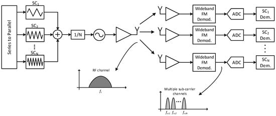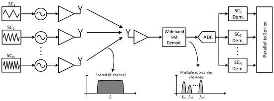 The SC-FDMA was proposed in [8] and further studied in [5]. The main principle is shown in Figure 11, where multiple transmitters are using the same RF band, but can be distinguished due to the fact that they use different sub-carrier frequencies. In order to perform successful demodulation, the wideband FM demodulator must provide sufficient linearity in order to avoid distortion and FM capture effect. In that regard, the DL demodulator is the best candidate, and, so far, the only one that has demonstrated such capability [6,7].