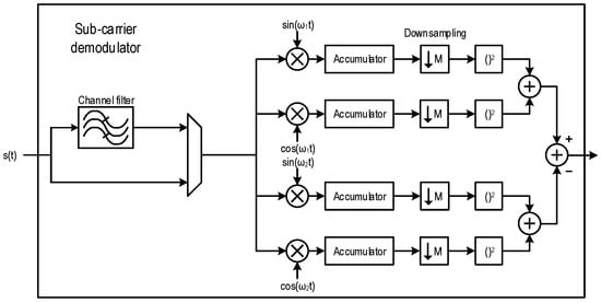A block diagram of an FSK demodulator based on correlators for processing a single sub-channel is shown in Figure 12. The proposed demodulator only illustrates the principle, and different simplifications can be used to optimize power consumption. For example, instead of using a sine wave, a square wave could be used, which would allow for removing multipliers and reducing complexity. The channel filter, which is the most demanding block here, only needs to be used if significantly stronger adjacent sub-channels are present; otherwise, it can be switched off to save power.