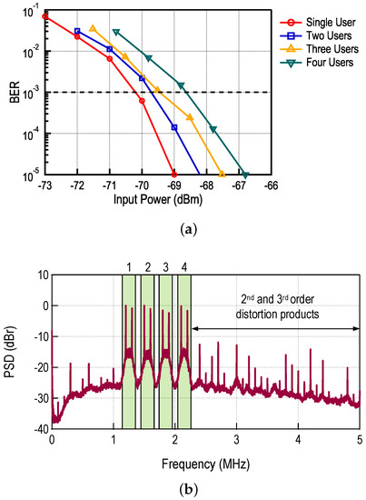 It should be noted that the output SNR is a non-linear function of the input SNR, which is a consequence of the square characteristic of the demodulator. Although the derived SNR expressions are a rather coarse approximation, they provide some intuitive insight into the performance limitations. First, the achievable BER is now limited by the inter-user interference (), which fundamentally limits the number of users or the maximum difference in powers between the two users. This factor, however, remains relatively small compared to noise at low SNR values. What can be noted in this region is that the “noise floor” has now increased due to cross-modulation of several input signals with noise (). In case a small number of channels is used, and the power difference between channels is small, this factor will dominantly determine the sensitivity degradation. The same derivation can be applied to the cases with three and four users: