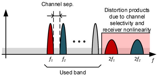 The second limitation comes from distortion. Any frequency selectivity present in the channel due to multipath propagation or non-linear demodulator characteristic will cause AM to appear on top of the FM-UWB signal. These amplitude variations transform into harmonic distortion in the process of demodulation and pollute the spectrum. If the minimum sub-carrier frequency is , then the spectrum at and above will contain significant components due to unwanted AM as illustrated in Figure 15. Placing a channel directly on top of these frequencies would result in significant BER degradation, and, for this reason, wouldn’t be practical. The sub-carrier band is therefore limited to one octave. If a larger band is required, the solution would be to move to higher sub-carrier frequencies. In the case shown here, frequencies from 1.1 MHz to 2.2 MHz are allocated to sub-carrier channels.