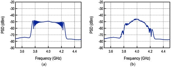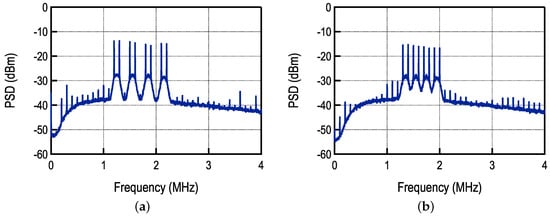 One important difference between SC-FDMA with multiple transmitters and a single transmitter is that, in the latter, sub-channels are perfectly synchronized. For multiple transmitters, even if the orthogonal frequencies are used for different sub-channels, the orthogonality is preserved only if symbols are perfectly synchronized. Since it is practically impossible to synchronize multiple transmitters, sub-channels must be separated and a channel filter is required. In the case of a single transmitter, the sub-channels remain orthogonal, so there is no need for separation, which allows for increasing the number of available channels. As long as the orthogonality is maintained, this separation will not influence the BER. In that regard, the proposed FDMA scheme is similar to the Orthogonal Frequency Division Multiplexing (OFDM) combined with the FM-UWB spread spectrum technique. The spectrum of the demodulated signal with and without separation is shown in Figure 18.
