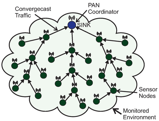 Operating mechanisms in Wireless Sensor Networks are usually application-dependent, in what concerns: node deployment, network topology, communication traffic patterns and communication protocols [20,21,22,23,24,25]. Regarding WSN traffic patterns, convergecast traffic is the most common traffic pattern in WSNs [26,27,28]. Convergecast traffic corresponds to typical sensing traffic (upstream) being periodically generated by sensor nodes and forward towards a sink node (usually at the PAN coordinator). Figure 1 illustrates a typical monitoring cluster-tree WSN, where static sensor nodes continuously transmit convergecast traffic.