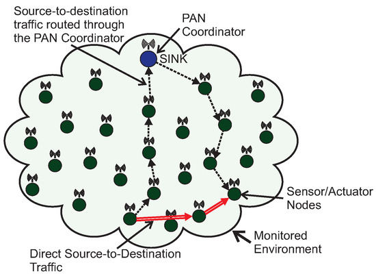 A major limitation when using traditional cluster-tree networks to support source-to-destination traffic is that data communication must follow the tree routing paths (dashed arrows in Figure 2). Thus, if source and destination nodes are not located in the same cluster, the message stream will be required to traverse multiple clusters towards the PAN coordinator (or, at least, a common parent cluster-head) and then down until reaching the destination node. This type of routing scheme generates higher end-to-end communication delays and potentially higher network congestion of the cluster-tree backbone nodes.