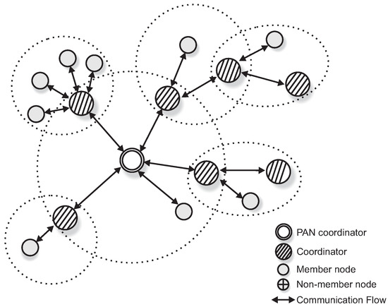 According to the IEEE 802.15.4 standard, the simplest case of a cluster-tree network is a single cluster (coordinated by the PAN coordinator). New nodes may be allowed to create their own clusters, increasing the coverage of the network. Within this context, several neighbouring clusters can be used to build wide-scale cluster-tree networks, where the coordinators are connected by parent-child relationships, forming a multicluster hierarchical network structure. Figure 3 shows an example of an IEEE 802.15.4 cluster-tree network.