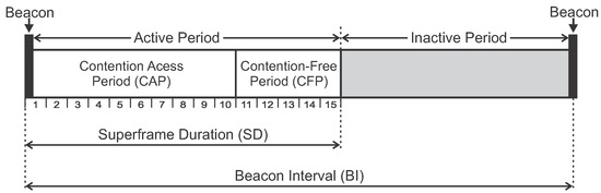 BI defines the interval at which the coordinator periodically transmits beacon frames. In turn, the SD parameter defines the length of the active portion of the superframe. The aBaseSuperframeDuration parameter defines the minimum duration of the superframe when SO is 0. The IEEE 802.15.4 standard defines this parameter with 960 symbols duration, which corresponds to 15.36 ms (assuming a network with bit rate of 250 kbps, frequency band of 2.4 GHz, and one symbol as 4 bits).