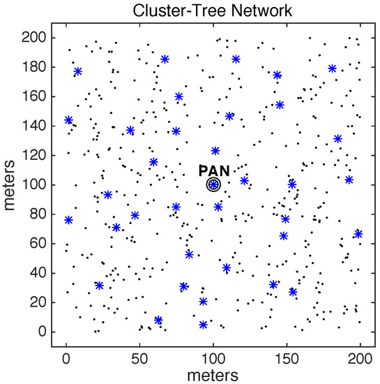 Figure 5 illustrates an example of this random cluster-tree network with 200 nodes. The PAN coordinator is located in the centre of the wide-scale communication environment. The dot marks represent leaf nodes and the asterisk marks represent cluster-head nodes.