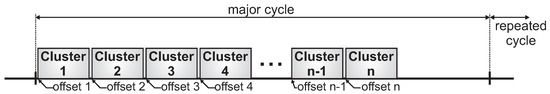 Koubaa et al. [7] proposed the Time Division Beacon Frame Scheduling (TDBS) approach, which defines a Superframe Duration Scheduling (SDS) algorithm for cluster-tree networks. In this approach, superframe duration and beacon frames of a given cluster are scheduled in the inactive periods of its neighbour clusters to avoid inter-cluster interferences. The schedulability condition of SDS is both necessary and sufficient, and is obtained considering the duty cycle information of nodes [15]. The TDBS approach defines minor and major cycles to schedule a cluster set with different superframe durations and beacon intervals. All clusters are organised within the defined major cycle, based on the Least Common Multiple (LCM) of the beacon periodicities for all clusters. The major cycle is divided in minor cycles, which are used to sequentially fit all clusters. In this approach, clusters are organised in an increasing order of beacon periodicities. To break ties, these clusters are organised in a decreasing order of superframe durations. Clusters are sequentially organised within the minor cycles, until reaching the end of the major cycle. TDBS defines the start time for all clusters in a collision-free scheduling scheme. However, it does not consider any message stream prioritisation and therefore may not be adequate to support time-sensitive applications.