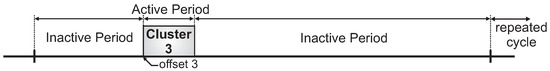 Figure 7 shows the duty cycle for cluster 3, considering a cluster-tree time division superframe scheduling. Note that the active period of cluster 3 starts at instant offset 3, where all of its sensor nodes wake up to sense the environment and to communicate. During the remaining inactive period, these nodes can sleep to save energy.