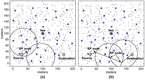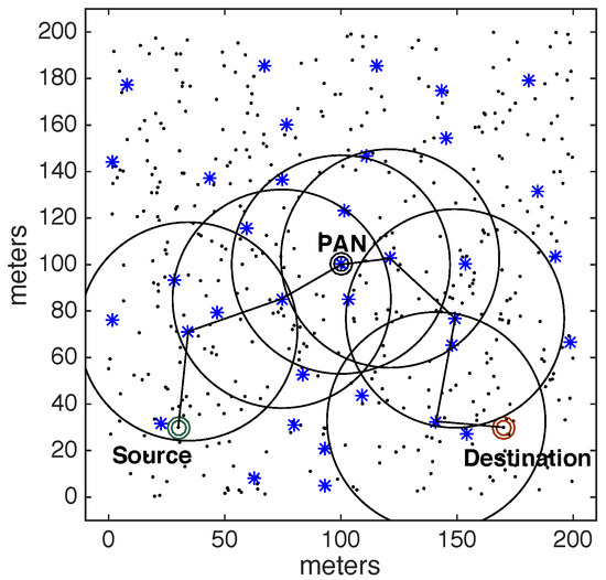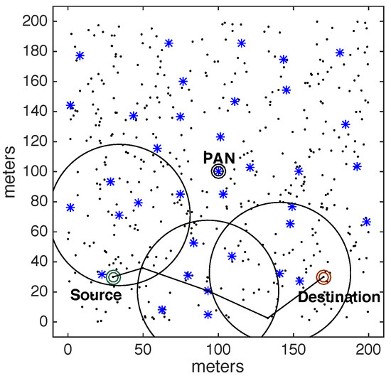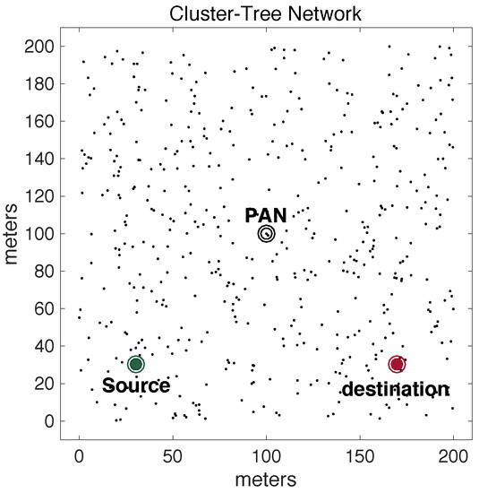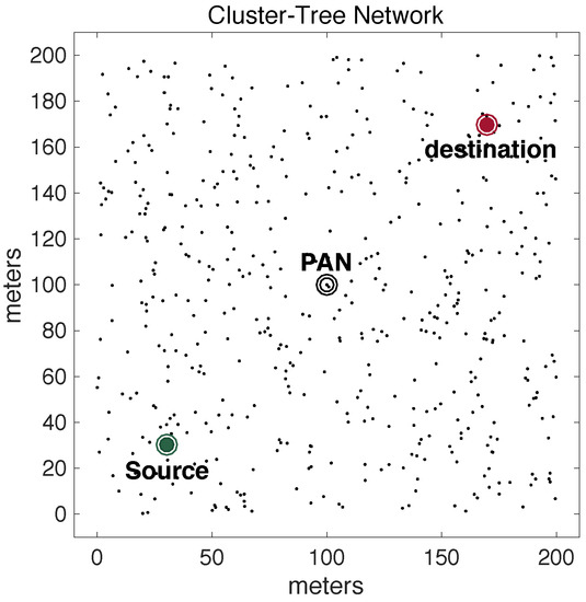 Consider an example of a cluster-tree network, where the pair source-destination is located in specific positions in the communication environment as shown in Figure 8.