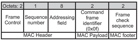 where i is a unique identifier for the specific cluster, S D i corresponds to the Superframe Duration and B I i is the Beacon Interval of the cluster-head C H i . We assume that values for BO and SO are defined according to the load supported by each of the branches of the cluster-tree, considering a superframe duration allocation approach, as the one proposed by [59]. We also assume that the cluster’s active periods were previously scheduled, considering a classical time division superframe scheduling approach, as the one proposed by [7]. Therefore, there are no beacon frame collisions caused by overlapping clusters. Importantly, for each node is assigned a hierarchical global address and all nodes operate over the same communication channel.