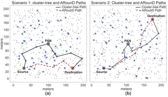 Figure 20. Cluster-tree and ARounD paths for one of physical topologies: (a) Scenario 1; (b) Scenario 2.