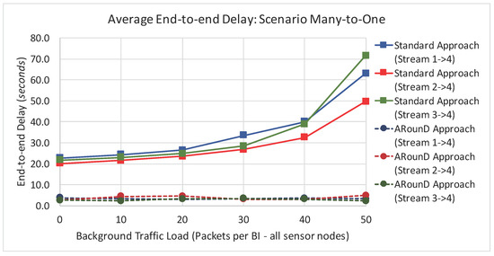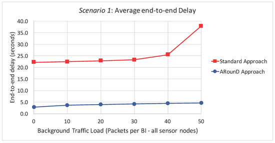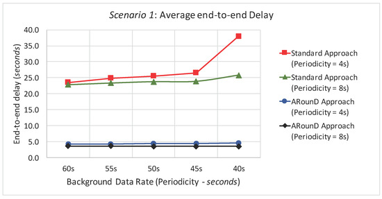 Figure 22. End-to-end Delay for ARounD Approach vs. Standard Approach in Scenario 1, considering different background traffic loads.