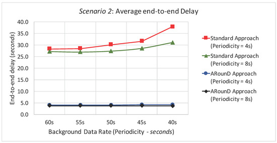 Figure 23. End-to-end Delay for ARounD Approach vs. Standard Approach in Scenario 2, considering different data rates for the background traffic.