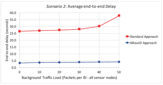 Figure 24. End-to-end Delay for ARounD Approach vs. Standard Approach considering Scenario 2, considering different traffic loads imposed by sensor nodes.