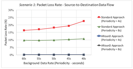 Figure 25. Packet Loss Rate for ARounD Approach vs. Standard Approach for Scenario 1, considering different data rates for the background traffic.