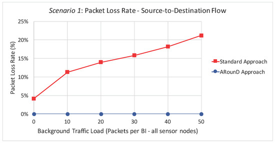 Figure 26. Packet Loss Rate for ARounD Approach vs. Standard Approach for Scenario 1, considering different traffic loads imposed by sensor nodes.