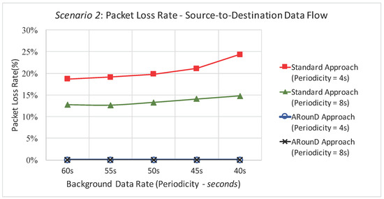Figure 27. Packet Loss Rate for ARounD Approach vs. Standard Approach for Scenario 2, considering different data rates for the background traffic.