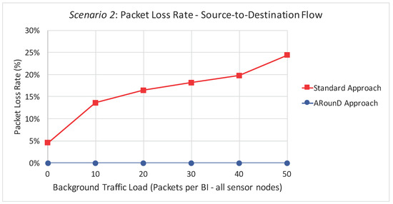Figure 28. Packet Loss Rate for ARounD Approach vs. Standard Approach for Scenario 2, considering different traffic loads imposed by sensor nodes.