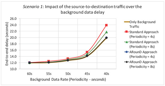 Figure 30. Impact of the source-to-destination data traffic (ARounD and Cluster-tree approaches) over the background data traffic delay, considering the Scenario 1.
